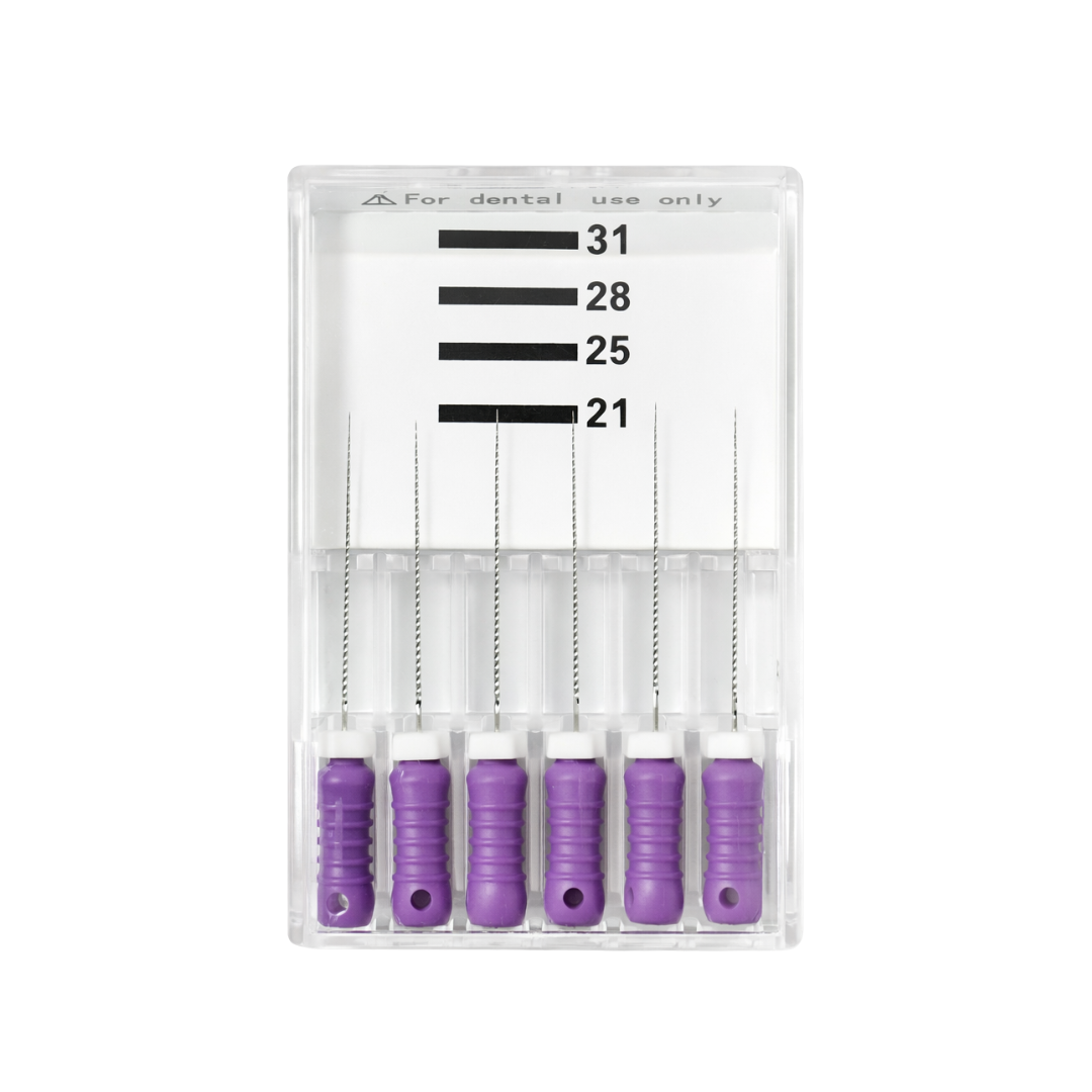 Answer: The k file works by mechanically scraping and enlarging the root canal space, allowing for thorough cleaning and preparation for filling.
