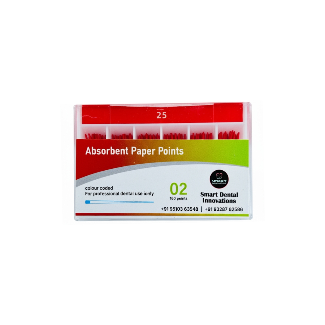 Absorbent Paper Points by Smart Dental Innovations are designed for efficient and reliable drying of root canals during endodontic procedures. Manufactured from high-quality, lint-free absorbent paper, these points ensure rapid moisture removal while maintaining canal cleanliness and safety.