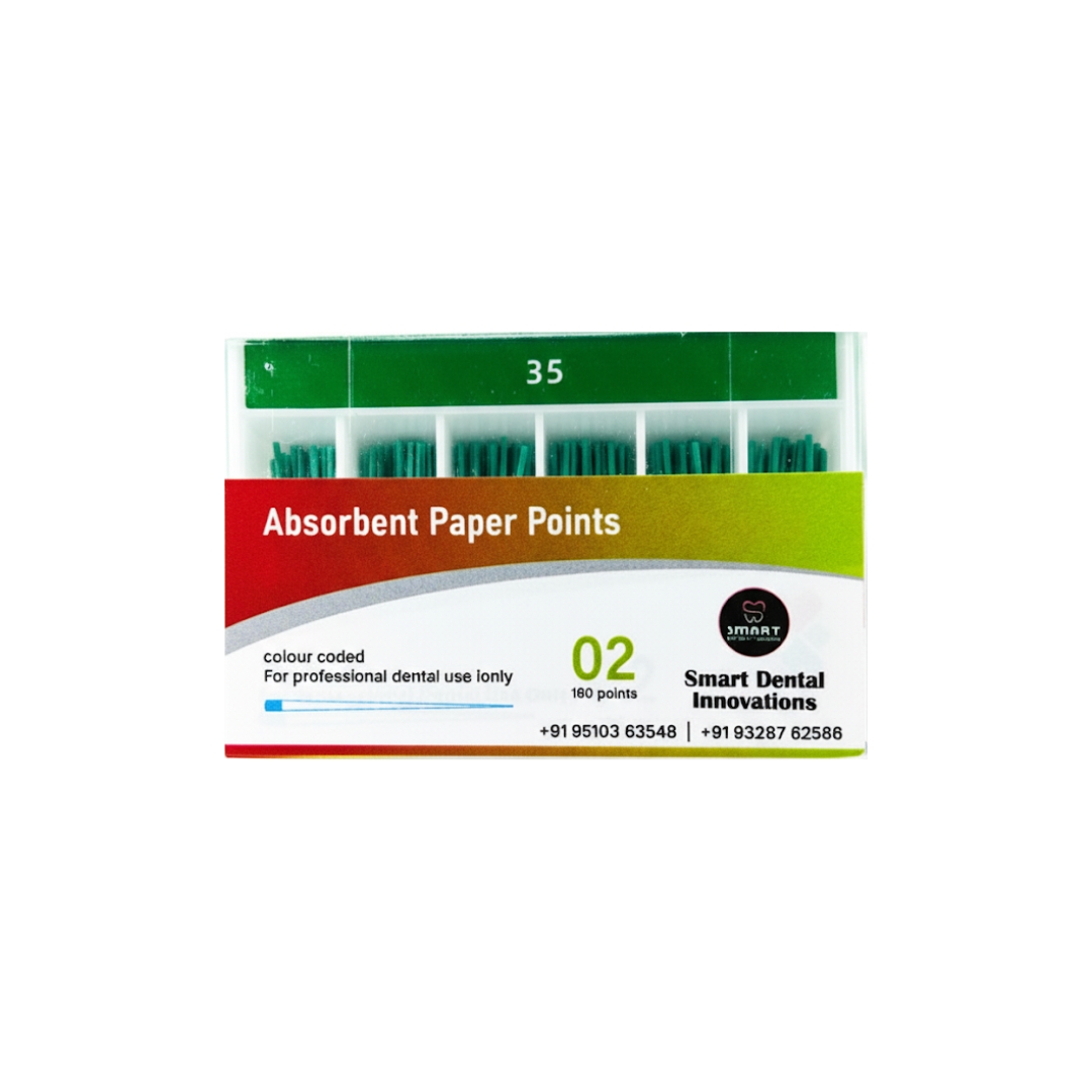 Absorbent Paper Points by Smart Dental Innovations are designed for efficient and reliable drying of root canals during endodontic procedures. Manufactured from high-quality, lint-free absorbent paper, these points ensure rapid moisture removal while maintaining canal cleanliness and safety.