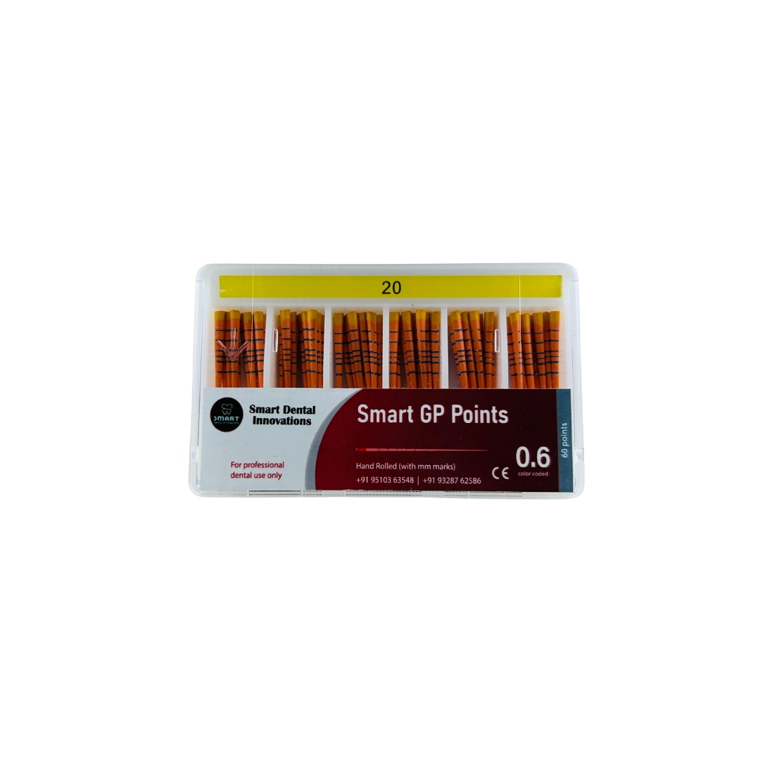 Smart GP Points are premium quality gutta-percha points designed for precise, predictable, and hermetic obturation in root canal treatments. Manufactured using the finest raw materials and hand-rolled for consistency, these GP points ensure excellent canal adaptation and reliable sealing performance.