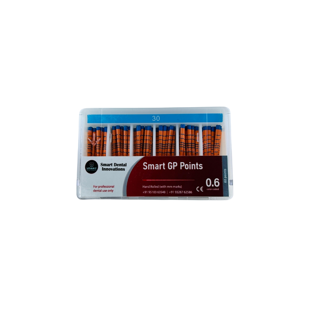 Smart GP Point is a gutta-percha (GP) point — a dental obturation material used for filling (sealing) cleaned root canals after endodontic treatment. The points are hand-rolled, colour-coded and length-marked for easy identification and accurate depth measurement.