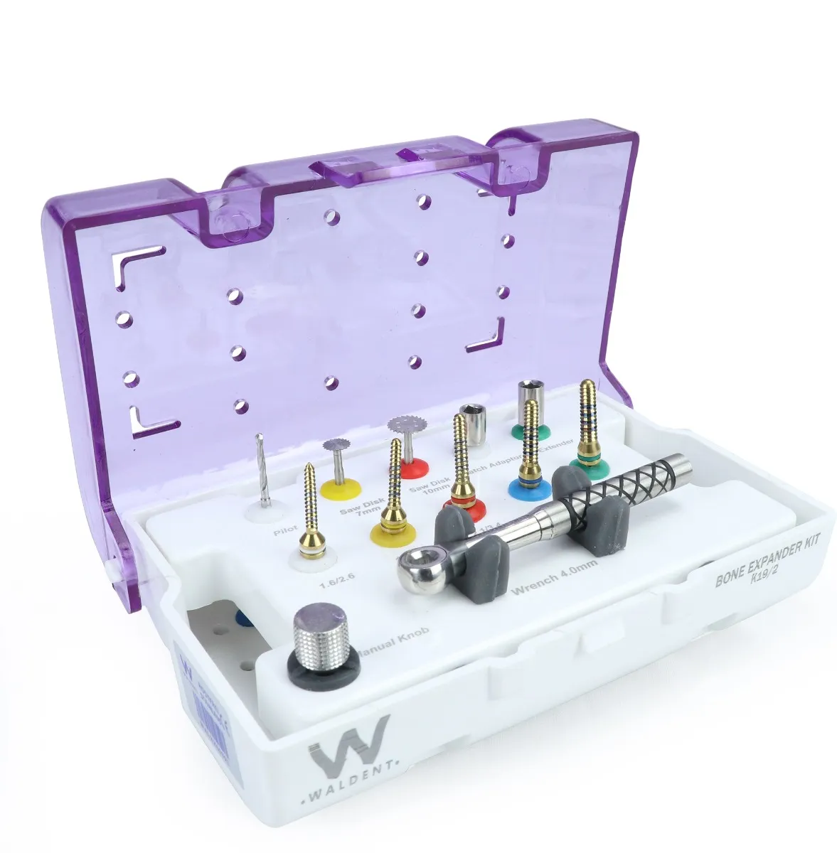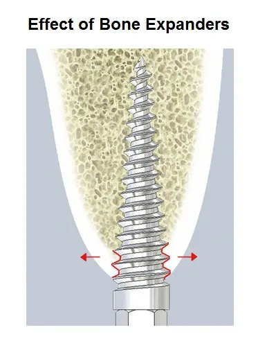 Answer: The kit uses assorted bone expanders of various diameters that are mounted on a handle and applied with gradual rotational pressure to expand bone channels gently during surgical procedures.