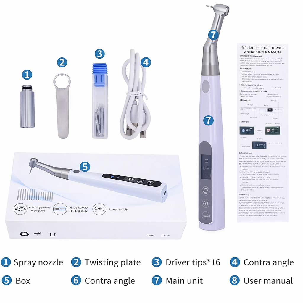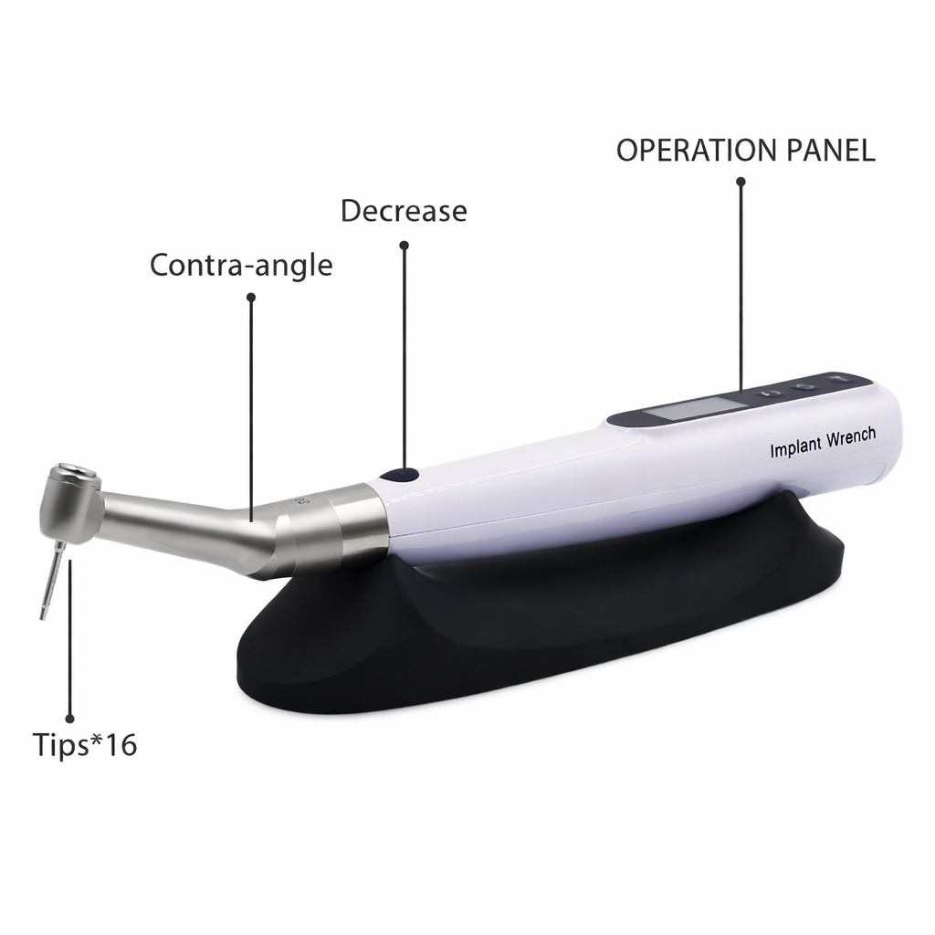 Answer: The implant torque wrench with 16 screws is a specialized dental instrument designed to deliver precise torque control when tightening implant abutments, prosthetic screws, and other implant components. it includes 16 assorted screws or drivers to support different implant platforms.