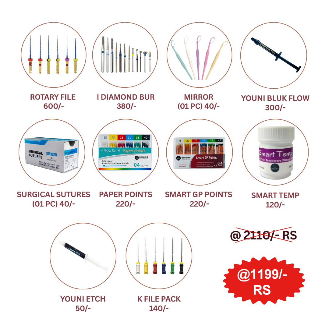 Answer: The pack includes a variety of commonly used consumables such as temporary restorative material, sterile cotton pellets, paper points, irrigation syringes, a mixed assortment of gutta-percha points, and single-use applicators.