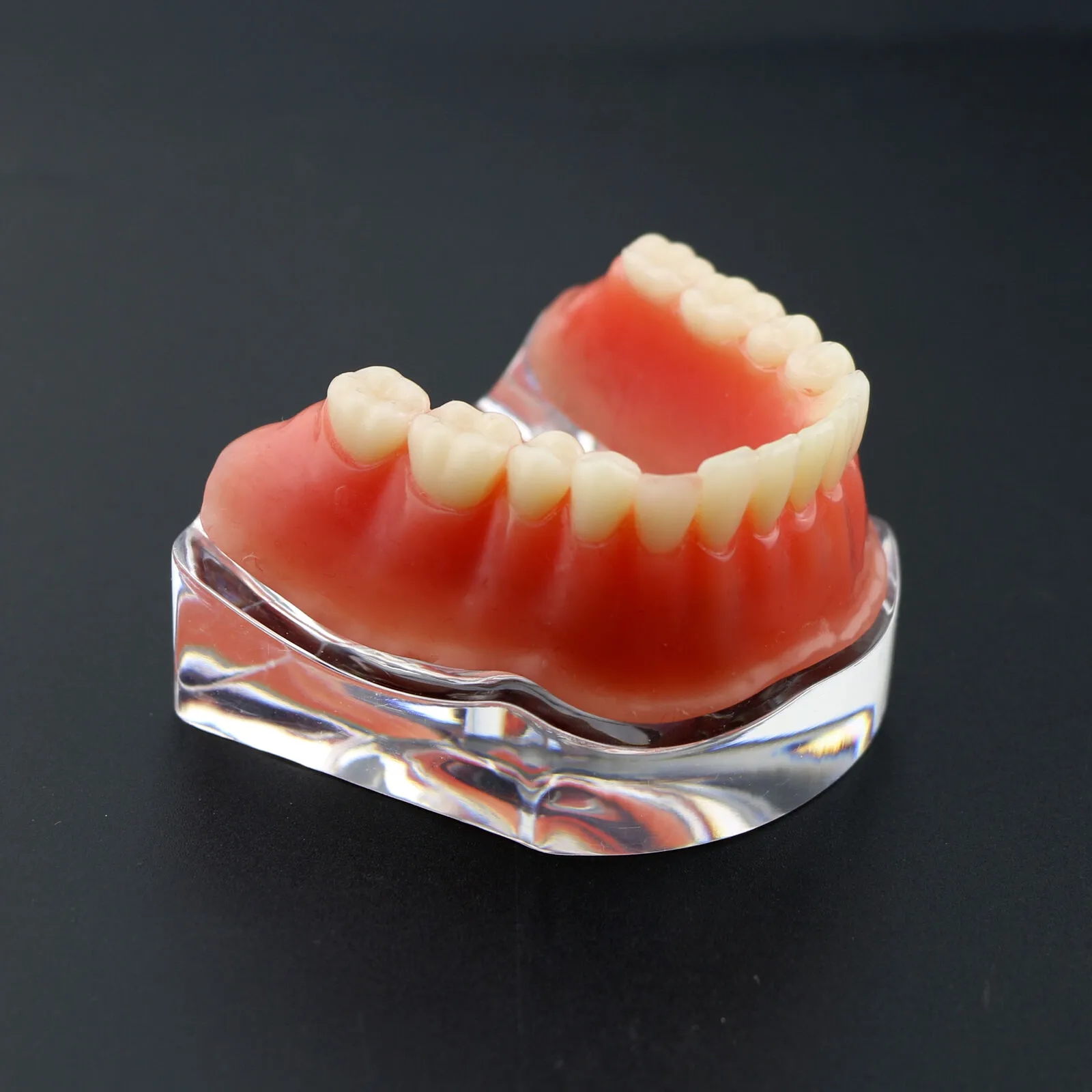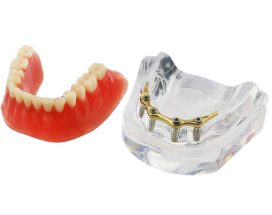 Answer: The implant model with bar is an anatomically accurate demonstration tool that shows implant-supported prosthetic solutions. it features multiple implant fixtures embedded in a jawbone structure connected by a rigid bar, illustrating bar-retained overdenture concepts for educational and clinical use.