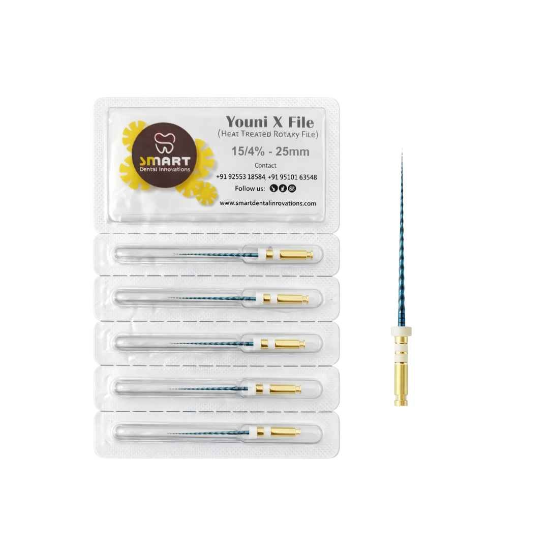 Youni X File is a heat-treated rotary file system designed for smooth canal shaping, better flexibility, and controlled cutting during root canal treatment.