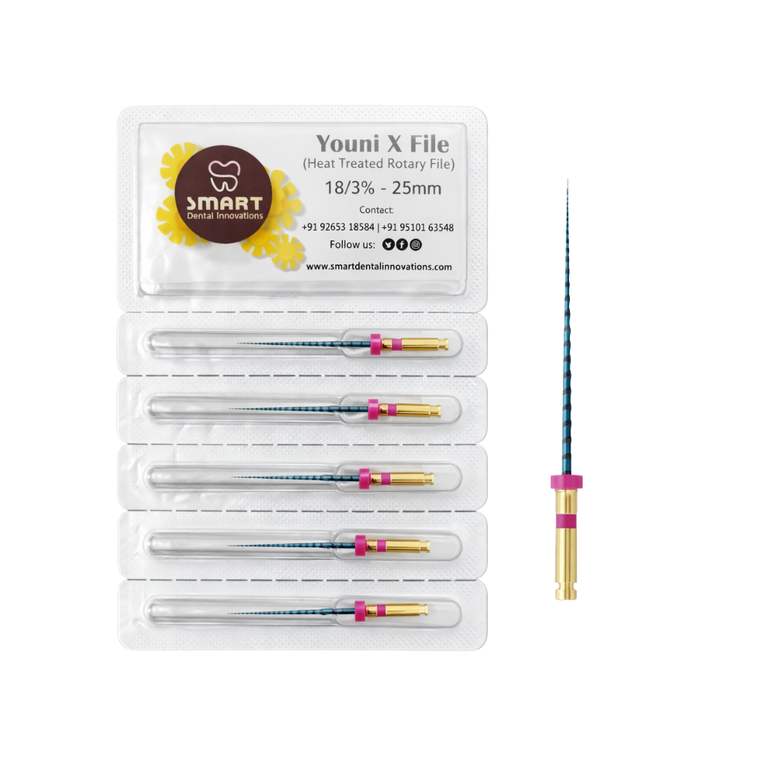 Answer: Youni x file is a high-performance rotary nickel-titanium endodontic file designed for safe, flexible, and efficient root canal shaping. it is heat-treated to enhance flexibility and resistance to file separation.