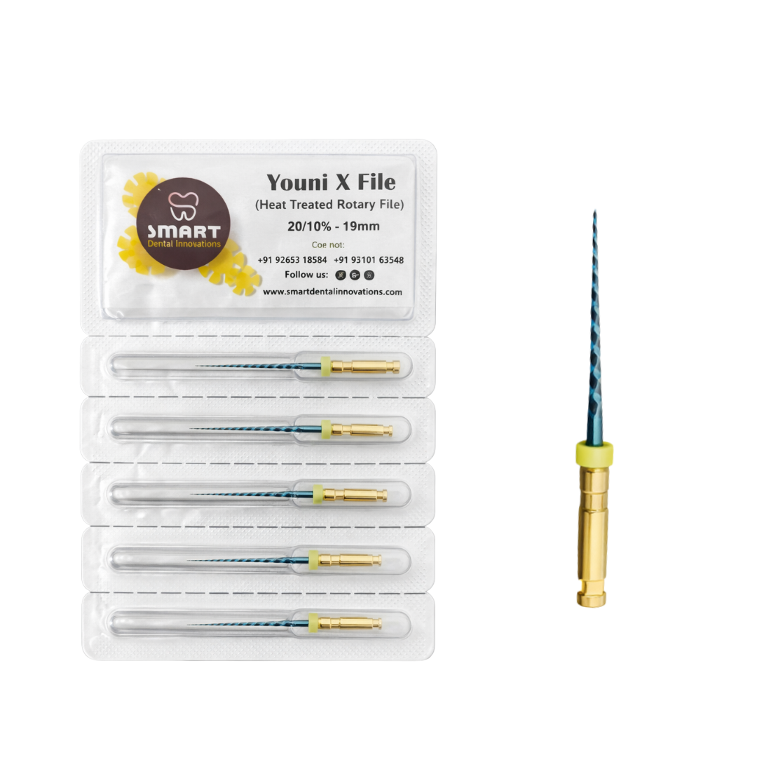 Youni X File is a heat-treated rotary file system designed for smooth canal shaping, better flexibility, and controlled cutting during root canal treatment.