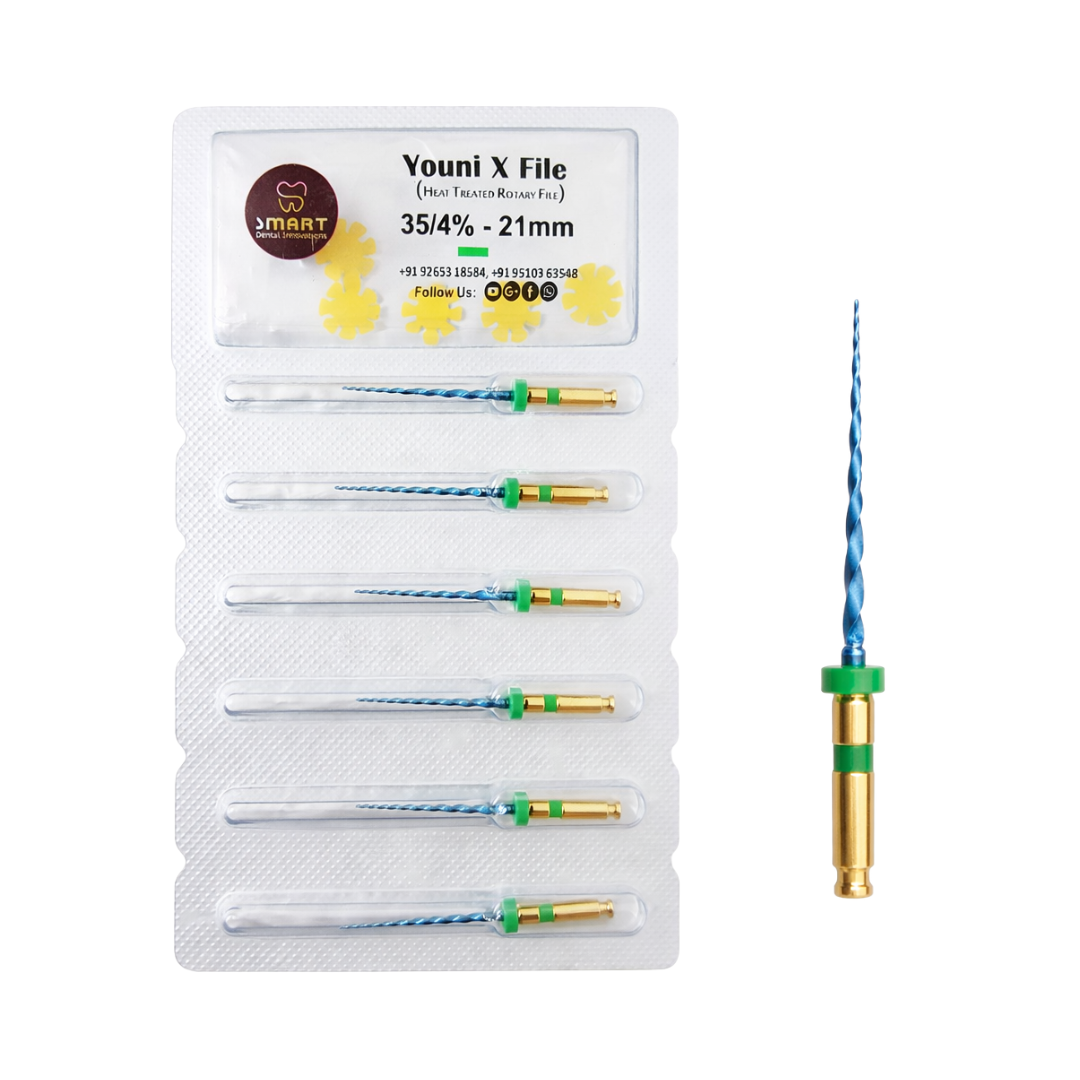 Youni X File is a heat-treated rotary file system designed for smooth canal shaping, better flexibility, and controlled cutting during root canal treatment.