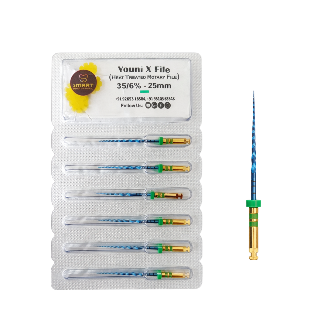 Answer: Youni x file is a high-performance rotary nickel-titanium endodontic file designed for safe, flexible, and efficient root canal shaping. it is heat-treated to enhance flexibility and resistance to file separation.